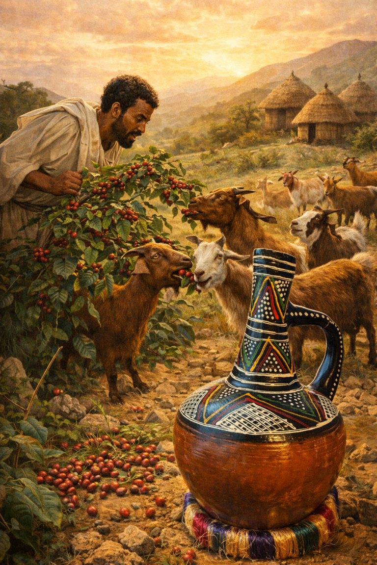 Die Ursprünge des Kaffees liegen in den Hochlandregionen Äthiopiens. Historischen Überlieferungen zufolge entdeckte ein Hirte namens Kaldi im 9. Jahrhundert die Wirkung der Kaffeekirschen, nachdem seine Ziegen nach deren Verzehr besonders lebhaft wurden.